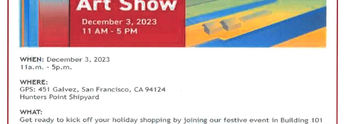 Get ready to kick off your holiday shopping by joining our festive event in building 101 of Hunters Point Shipyard! Experience the holiday spirit with over 50 artists and their creations.